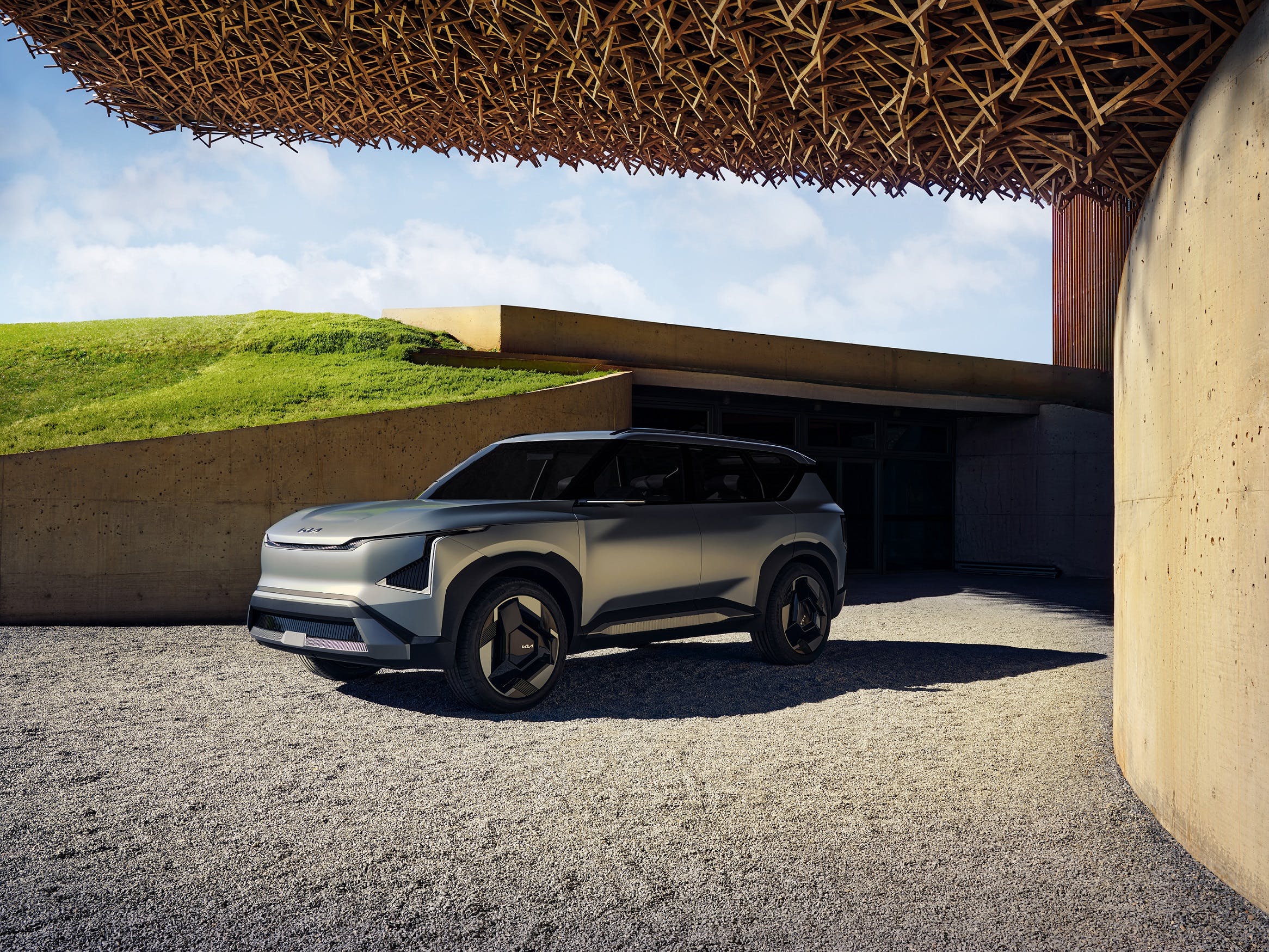기아의 디자인 철학인 ' Offer United'은 자연과 조화되는 대담함을 반영합니다. 외관은 디지털 타이거 페이스, 주간 주행 등으로 형성된 스타맵 시그니처 조명, 기하학적이고 기술적인 형태의 휠과 휠 아치 등의 디자인 요소가 특징으로 보입니다. 이 디자인은 깔끔한 차체 면과 어우러져서 콘셉트 카의 디자인을 거의 모두 반영한 것으로 보이며 EV9을 축소시킨 것 같다는 반응이 많습니다. 현재까지 알려진 전장은 4,615mm 전폭은 1,875mm 전고는 1,715mm 휠베이스는 2,750mm라고 하며 후면의 D필러를 통한 실내 공간의 활용성을 극대화했습니다. EV5는 EV9과 패밀리룩을 유지하면서도 좀 더 작은 차체에 맞게 귀엽게 디자인된 모습으로 보입니다. 후미등은 다른 기아패밀리차와 유사한 가로로 길게 이어진 모습을 하고 있으며 이것은 차가 좀 더 넓어 보이는 효과가 있습니다. 옆모습 비율도 아주 괜찮아 보입니다. 좀 더 역동적인 모습을 하고 있고, 루프 뒤로 떨어지는 라인도 완만하여 실내 공간의 효율과 디자인적으로도 괜찮아 보이며 휠은 검은색과 은색을 적절히 조화시켜서 전체적으로 좋은 디자인을 보여주고 있습니다. EV5 인테리어는 '자연과 인공성의 경계 없는 조화'를 콘셉트로 하며 EV9과 동일한 스티어링 휠이 들어가 있습니다. 가로로 긴 디스플레이도 시안성이 좋아 보입니다. 운전석에는 마사지 기능이 제공되는 릴랙션 시트가 적용이 되어 충전 시 또는 정차 및 주행 시 피로를 줄일 수 있습니다. 또한 1열에는 벤치 스타일의 시트가 적용이 되어 운전석과 동승자 사이의 공간이 새롭게 제공됩니다. 2열의 시트는 완전히 접히는 풀 플랫이 가능하도록 설계되었으며 완전 평탄화 되는 장점이 있어서 캠핑을 할 때에 유용하게 보입니다. 그리고 센터콘솔 후방 슬라이딩 트레이와 조수석 시트 후면 테이블로 공간활용 가치를 높였습니다. 2열의 시트는 완전히 접히는 풀 플랫이 가능하도록 설계되었으며 그로 인해 새로운 화물 공간 확보를 기대할 수 있습니다. EV SUV시리즈가 모두 넉넉한 적재 공간이 있어서 활용성을 극대화했다고 보입니다. 또한 플로어 아래쪽에는 추가 수납공간이 있어서 이 역시 활용도가 높아 보입니다.